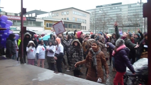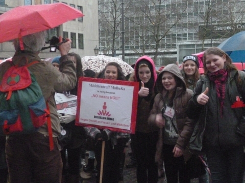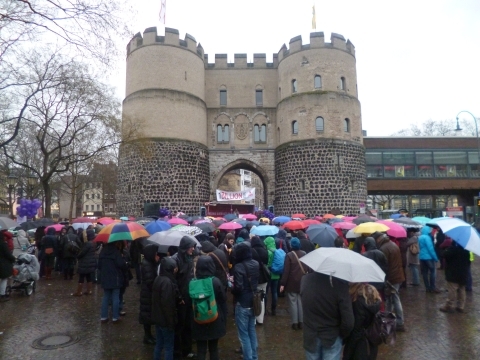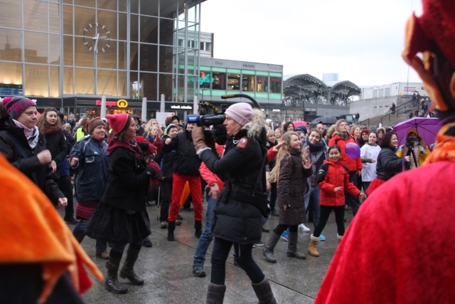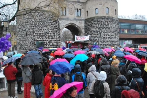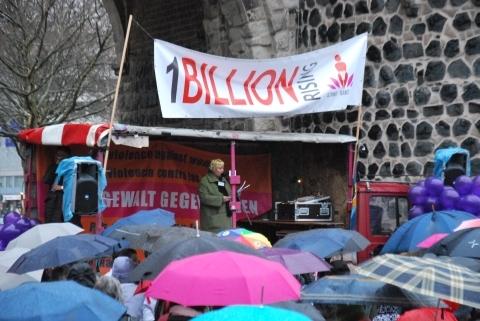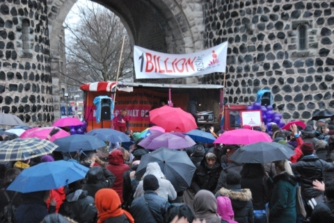 14. Februar 2014: Die Kölner Veranstaltung zum weltweiten ONE BILLION RISING-Aktionstag (OBR) auf dem Rudolfplatz war trotz anhaltenden Regens mit rund 400 Teilnehmenden ein großer Erfolg. Mehr dazu: One Billion Rising – gemeinsam für Gerechtigkeit!