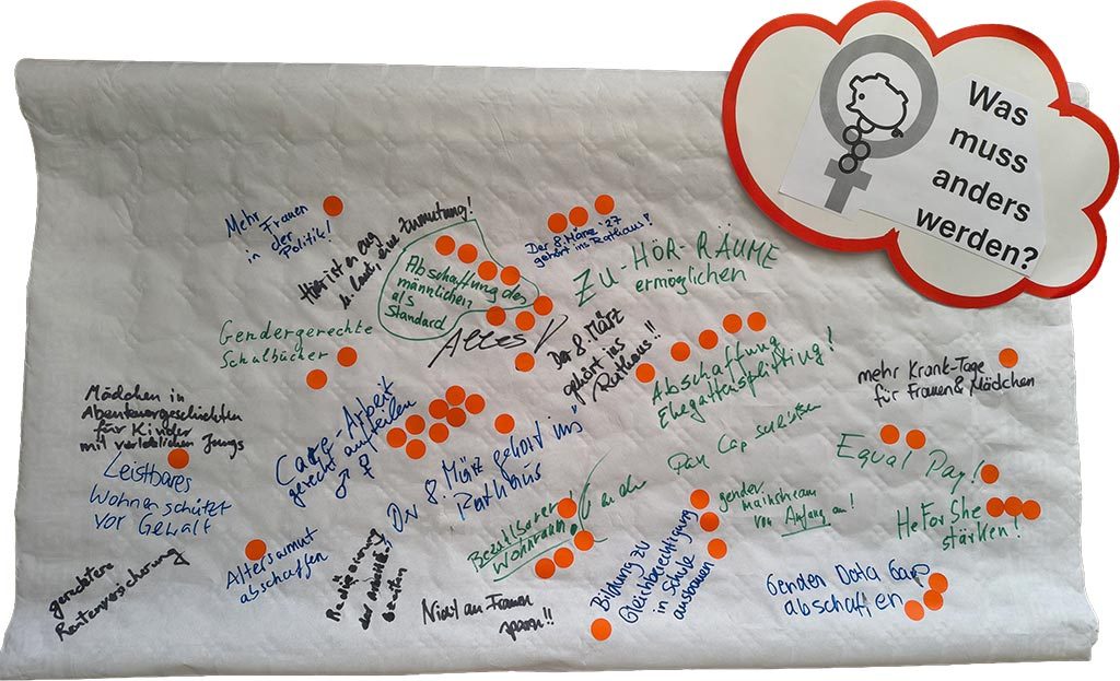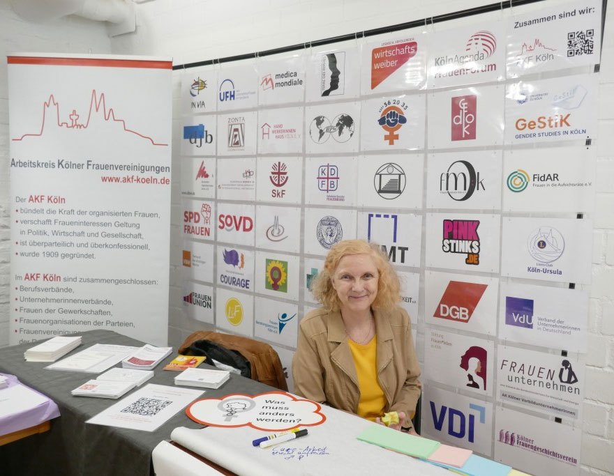 Ein voller Erfolg war die Mitmach-Aktion am Tisch des AKF Köln zum Internationalen Frauentag 2026. Vor der beeindruckenden Logo-Wand der Mitgliedsorganisationen ging es um das Thema ‚Frauen und Armut‘. Die Frage war: „Was muss anders werden?“